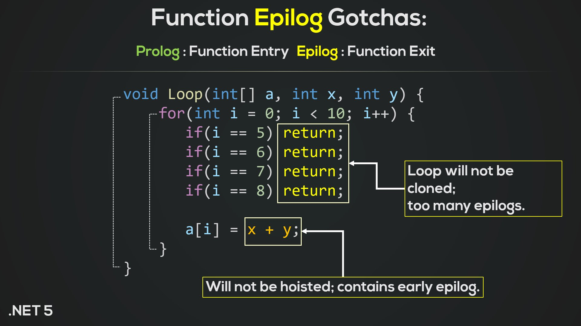 While it's difficult to translate what a prolog and Epilog mean in user code (since a return statement is not necessary, an epilog), if we have too many returns from a function in a loop, optimizations will be off.