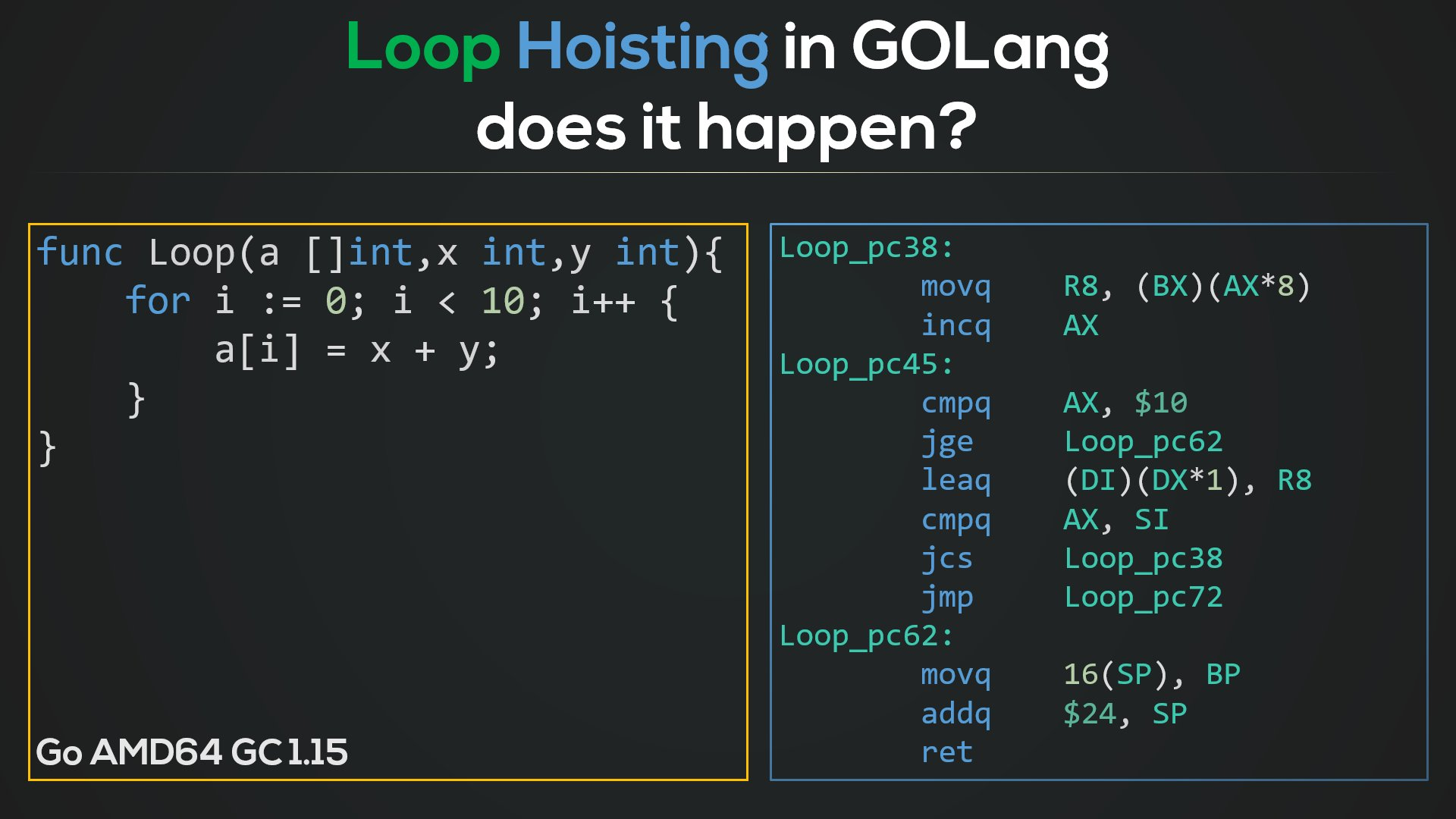 In my simple tests, I hardly saw any advanced optimizations applied in the GO compiler. I'm told that this is a part of the philosophy of everything being simple in GO, both at the language level and the compiler level.