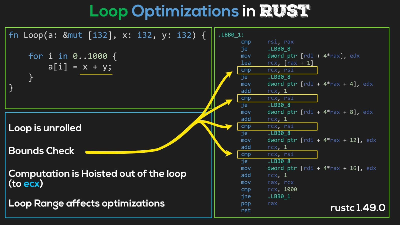 As you can see the compiler managed to figure out that the program will not crash in the fast case and removed all of the bounds checks. It's a good practice to create a slice and work on that slice since this will allow the compiler to make correct decisions.
